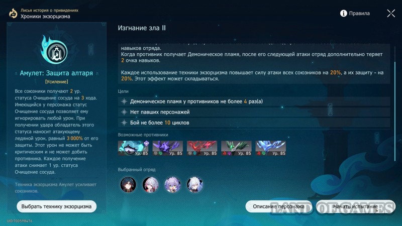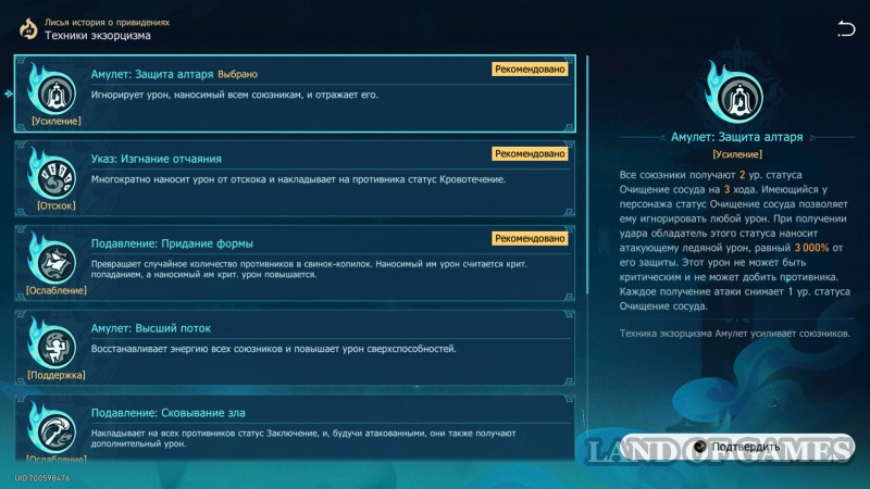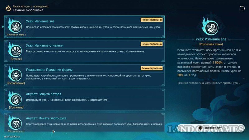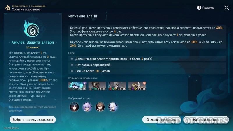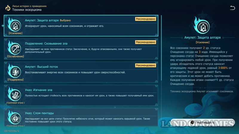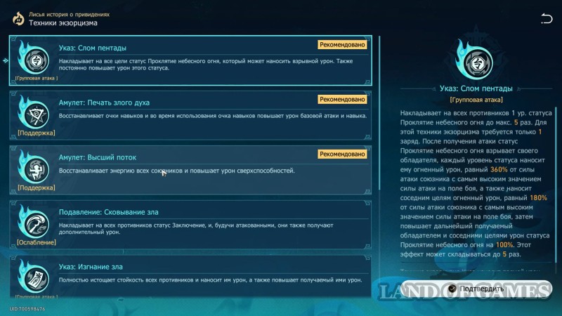При подборе техники также обратите внимание: активация любой из них дополнительно дает бафф в 20% к защите и АТК во всех Изгнаниях зла (эффект настакивается).
