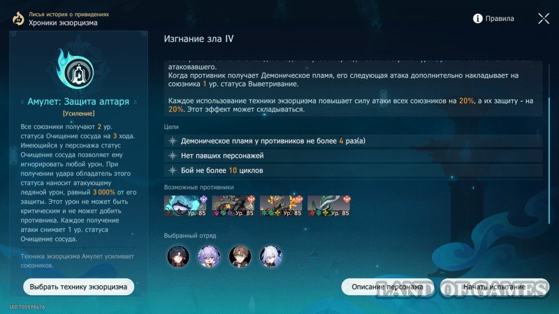 F2P команда, в которой лучше не пренебрегать ролью Март 7 — Изгнание зла IV, как ни один другой уровень, требует от отряда наличия снимающего негативные статусы персонажа. Среди бесплатных героев только Март поможет вам вовремя убирать со своих юнитов стан или метку цели. На роль саппортов сюда же можно поставить Юйкун, а если нет другого лекаря — Наташу.