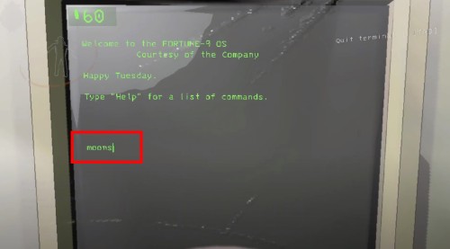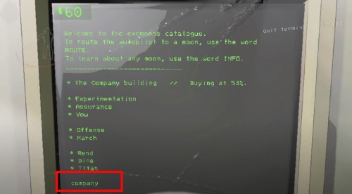 Собрав достаточное количество лома, возвратитесь к своему кораблю и подойдите к терминалу – взаимодействуйте с ним, чтобы перейти в командное меню. Затем напишите в нем слово moons (луны), и вы увидите вверху списка надпись «The Company building»