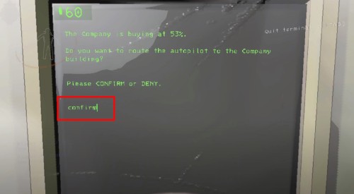 Далее напишите команды company (компания) и confirm (подтвердить), чтобы транспортное судно отправилось к зданию компании. Затем посмотрите на экран слева от терминала. Если видите на нем надпись «Where the Company resides»