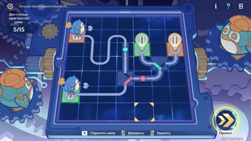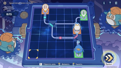 На втором этапе будут уже два источника сигнала и две конечные точки. Они отличаются друг от друга разными цветами и цифрами, поэтому вы их не спутаете. На создание маршрутов вам выделят 15 фрагментов цепи.