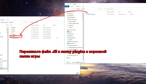 Откройте указанную папку. В ней вы обнаружите папку plugins, в которой находится файл MoreCompany.dll. Его вам необходимо будет перекинуть в папку plugins, находящуюся уже в директории игры.