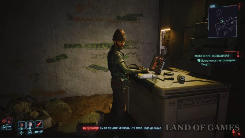 Первым делом переговорите с нетраннером мистера Хэндса. Найти его не составит труда. От того места, где только что получили задание, поворачивайте налево и пробегите буквально 15 метров.