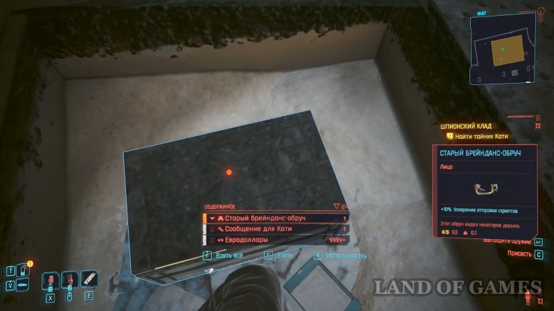 Под ним обнаружите кейс с наградами: информационный носитель с данными, старый брейнданс-обруч, а также 11906 евродолларов.