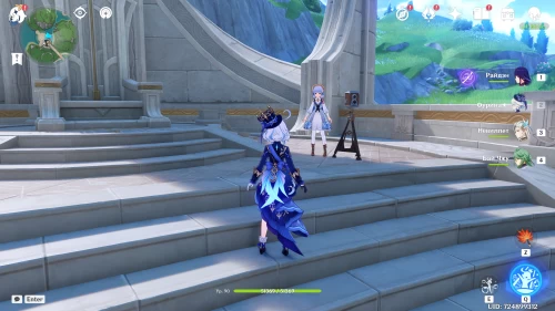 Представители Инадзумы и Фонтейна стоят рядом с Дворцом Мермония на одном уровне со статуей Архонтов и обсуждают перспективы сотрудничества своих регионов.