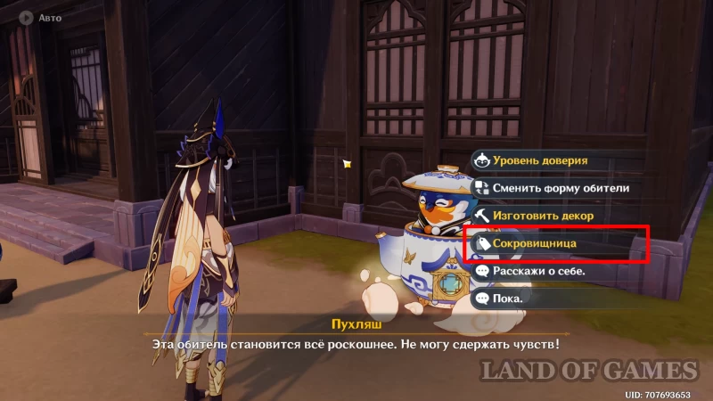 Первым делом переместитесь в свой чайник и побеседуйте с его хранителем, зябликом Пухляшом: среди вариантов диалога с духом выбираем команду «Сокровищница», а в открывшемся окне — раздел «Богатства обители» (из списка вкладок слева).