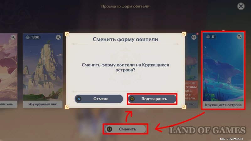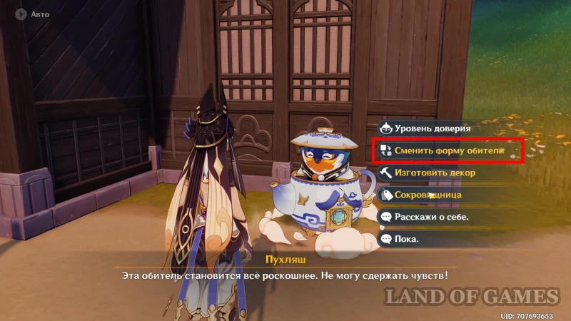 Возвращаемся к диалогу с Пухляшом: кликаем по строчке «Сменить форму обители», затем проматываем список обителей в конец и выбираем последнее окошко с подводным пейзажем. Жмите «Сменить» и подтвердите свой выбор — после этого вас загрузит в локацию с новым чайником.