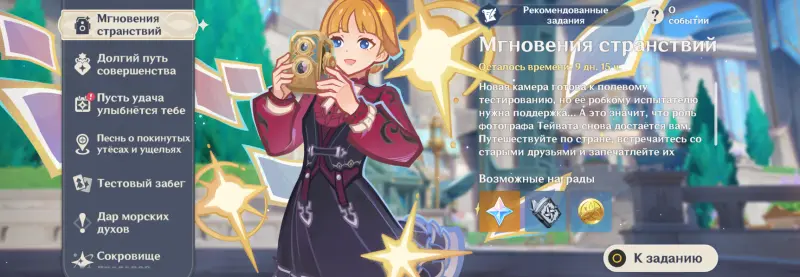 В ивенте «Мгновения странствий» игроки снова выступят в роли фотографа: новая модель Камеры проходит полевые испытания, а ее стеснительному тестировщику требуется наша помощь. На протяжении первых 5-и дней мероприятия ежедневно будут открываться по две съемочные точки, где предстоит запечатлеть самые выразительные и уникальные моменты жизни знакомых персонажей. Первое успешное фото в каждой локации позволит разблокировать награды в меню события. Подробнее об этом мы рассказали в отдельном гайде.