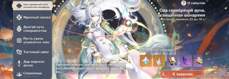 Ежегодное празднование и фестиваль морских фонарей в Ли Юэ под названием «Ода серебряной луне, освященная фонарями» — это основной ивент версии 6.3, поделенный на 4 тематических активности, за прохождение которых вы получите более 1000 примогемов, скин на Яо Яо, селектор с выбором 1-го эпического героя Гео региона, а также множество праздничных впечатлений. Подробнее о событии мы рассказали в отдельном материале.