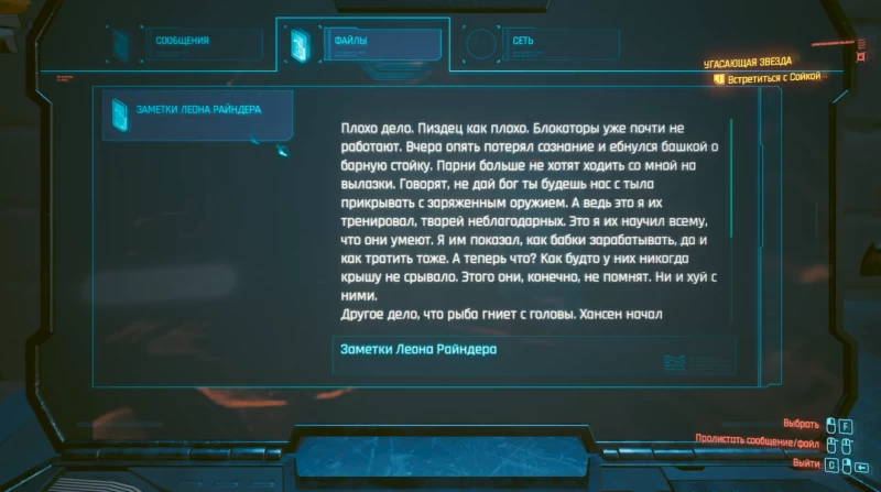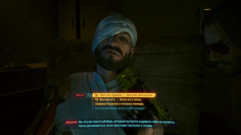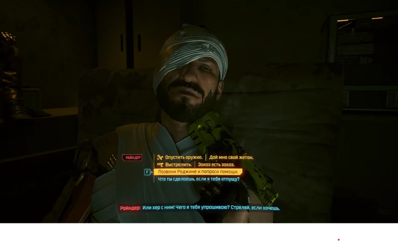 Ближе к концу диалога ответьте Райндеру «Советую выбирать слова», а после этого «Дай мне свой жетон» или «Позвони Реджине и попроси о помощи». В любом из вариантов Райндер останется жив, а через несколько дней пришлет Ви сообщение с координатами своего тайника.