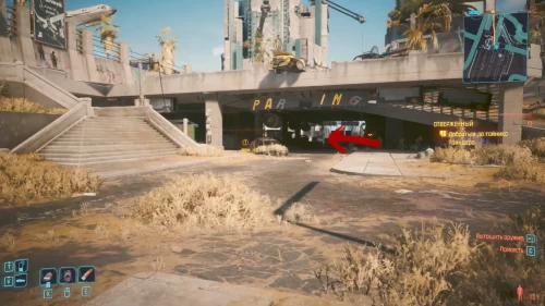 Затем следуйте под мост с вывеской «par ing». Тайник находится в гараже с терминалом доступа. Введите на кодовой панели цифры, которые вам прислал Райндер: 1975, и зайдите в гараж.