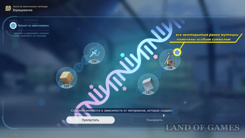 Те, что еще не разблокированы, помечаются знаком вопросика — остается найти путь к мутации с этим незафиксированным признаком (выше разместили скриншот, который поможет найти признак по материалу для скармливания).