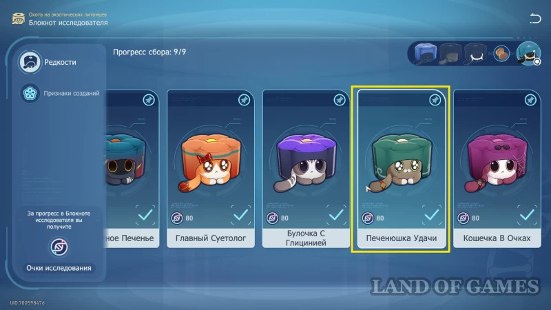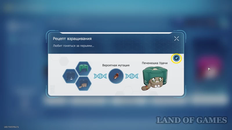 Откройте интерфейс Печи жизни и зайдите в раздел «Редкости»: ближе к концу списка кликните на рецепт Печенюшки Удачи, а после закрепите цель (значок скрепки). Вернитесь на главный экран и кликните по одному из окон с питомцами — откроется меню генерации.