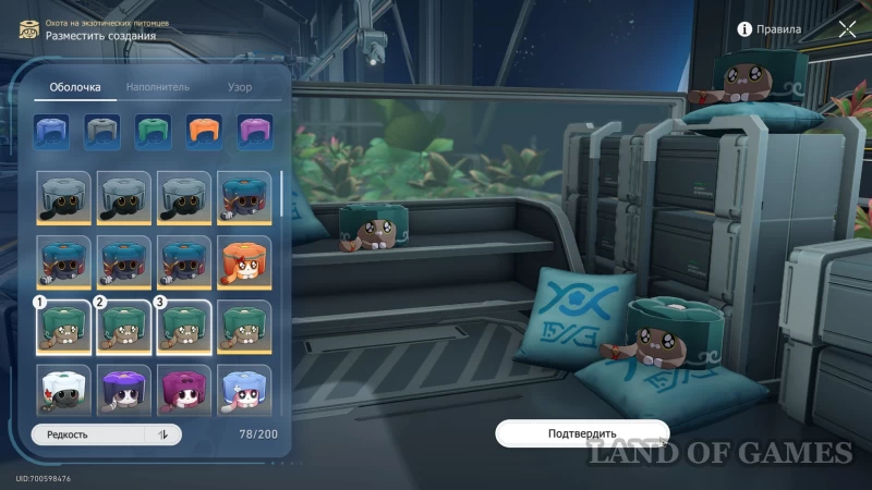 Остается подобрать особенности: зеленую оболочку, наполнитель кофейного цвета, а также пятнышки на лапках и мордочке. Выберите из списка готовых особей двух существ, чей набор признаков покрывает все цели рецепта, а после запустите взращивание минимум 2 раза (с учетом созданной по квесту Печенюшки Удачи, их как раз будет три). Когда откроется окно с материалами для скармливания, выберите Перо пламени.