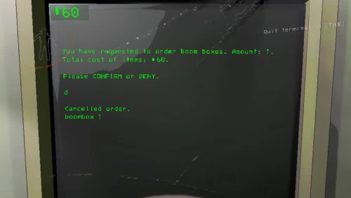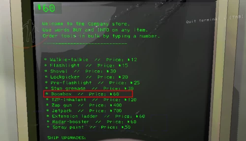 В верхней части ассортимента вы увидите бумбокс, продающийся за 60 кредитов одна штука. Для покупки одного магнитофона вам нужно ввести команду boombox 1, а затем подтвердить ее, написав слово confirm.