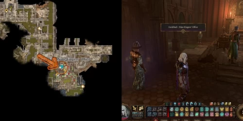 Все в той же Гильдейской таверне пройдите в офис Девятипалой, а затем взаимодействуйте с книжной полкой в спальне и пройдите проверку на Ловкость рук (25 единиц), чтобы разблокировать потайной вход, ведущий в канализацию.