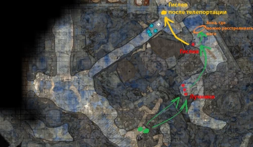 Если же Гислев останется жив, то он телепортируется вниз (соответствующая точка показана желтым цветом). Вы можете отправить туда своего бойца (полетом, телепортацией и так далее) или просто встать в область, обведенную оранжевым цветом, и расстрелять врага дальнобойными атаками.