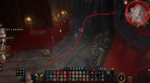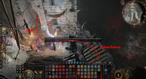 Впереди вы обнаружите культистов Баала, стоящих на верхней площадке и обстреливающих беженцев, – разберитесь с ними, а затем продолжайте идти на запад к двери (X: -37, Y: 795) в левом углу (можете спуститься вниз и осмотреть тела беженцев). Снова идите на запад, избегая расставленных ловушек, и взломайте следующую дверь, пройдя проверку на Ловкость рук (15 единиц).