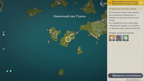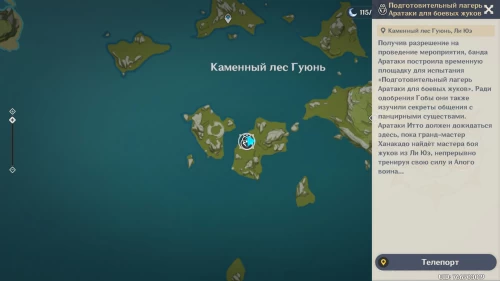 Затем отправляйтесь в Каменный лес Гуюнь и доберитесь до островка с квестовым маркером. Здесь вы увидите Сян Лин и Аратаки Итто. В конце беседы ваши друзья решат организовать новый турнир по боям жуков. После завершения ролика возвратитесь в ресторан и снова пообщайтесь с Куки и Янь Фэй.