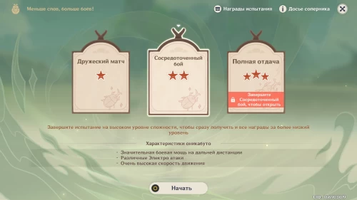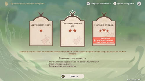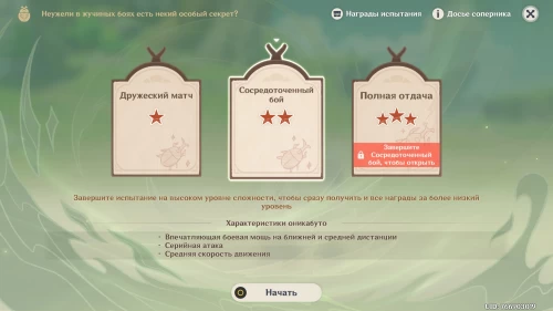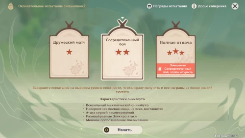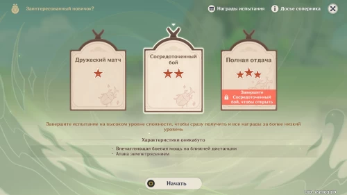 Переместитесь в Каменный лес Гуюнь в подготовительный лагерь и вступите в диалог с Янь Фэй. Затем вам нужно выбрать сложность – сначала пройдите Дружеский матч и Сосредоточенный бой (можно начать сразу с него), чтобы открыть Полную отдачу. Изучите характеристики оникабуто и досье соперника, чтобы знать, что вас ждет во время боя.
