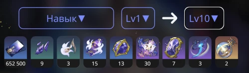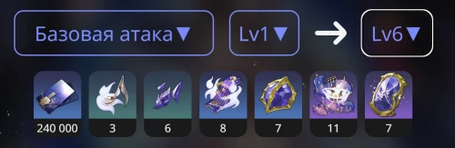 На картинках ниже демонстрируются материалы и их количество, необходимое для максимальной прокачки базовой атаки, навыка, сверхспособности и таланта.