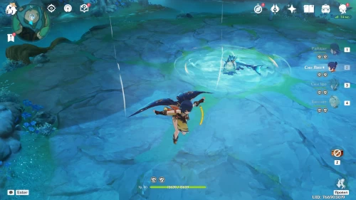 Под ногами персонажа возникает водоворот, а затем босс бьет по земле, вызывая всплеск, наносящий Гидро урон по площади.