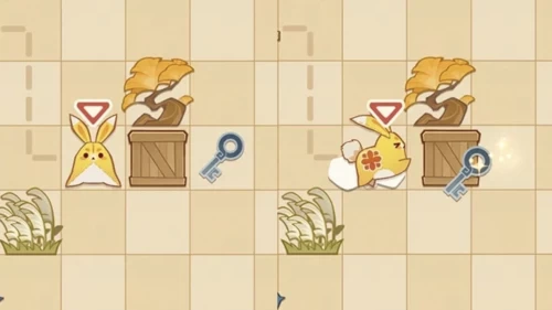 Переключитесь на кролика и подвиньте коробку справа наверх до упора. Затем возьмите под управление Гобу и толкните ящик вправо. Снова перейдите на Юэгуя и начните двигать коробку вверх, пока у него не останется ходов. Опять перейдите на мишку и продолжайте толкать ящик, чтобы забрать синий ключик.
