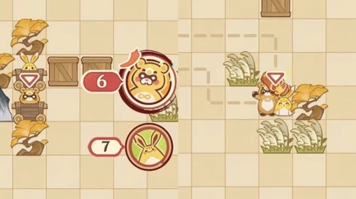 Возвратитесь кроликом в тележку, а потом подвиньте ее влево медведем. Снова возьмите под управление зайчонка и дойдите им до красного ключа наверху. Сядьте Гобой в тележку переключитесь на Юэгуя и подвиньте телегу вниз в сторону гриба. Теперь дойдите обеими зверюшками до еды.