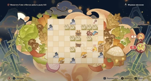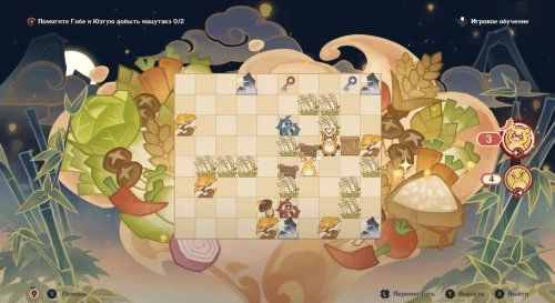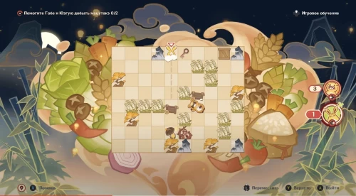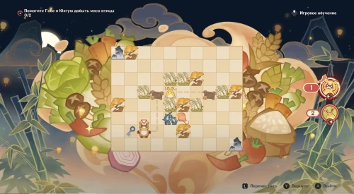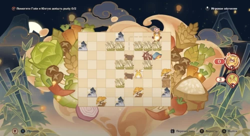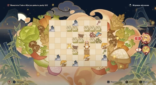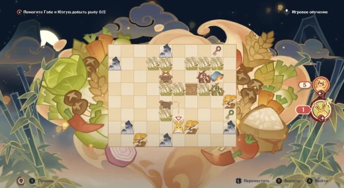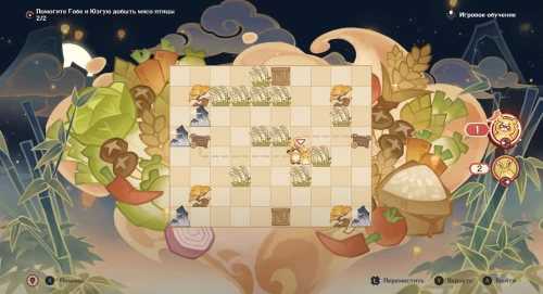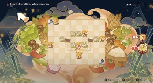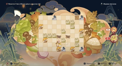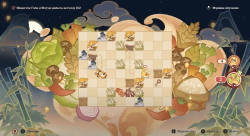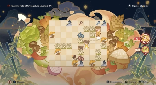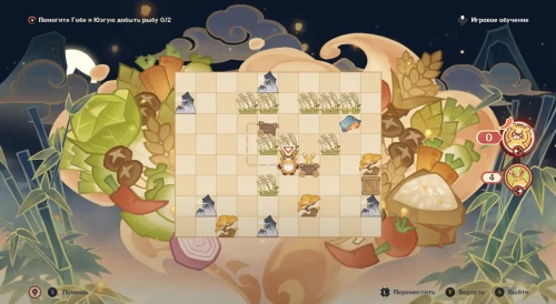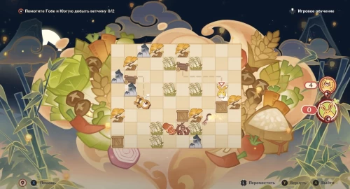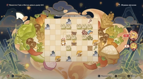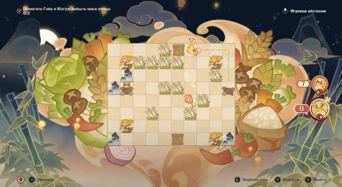 Вам необходимо будет направлять Юэгуя и/или Гобу к кухонным ингредиентам, нажимая на кнопки перемещения и расходуя ходы. При удержании клавиши передвижения персонаж будет идти непрерывно. Для выполнения испытания нужно подобрать все предметы для готовки.