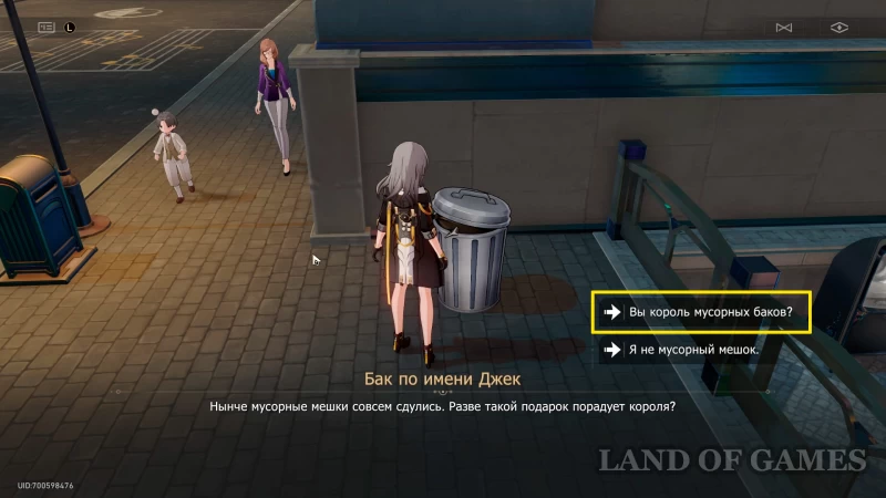 Здесь же, переде оградой, стоит королевская мусорка по имени Джек. За корректную беседу с ним вы получите дополнительно 20 нефрита, однако выбирать ответы нужно в таком порядке: