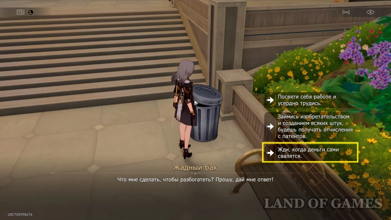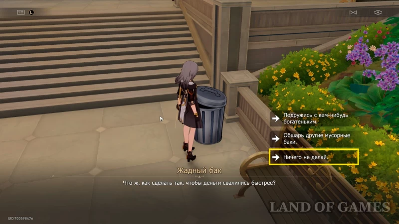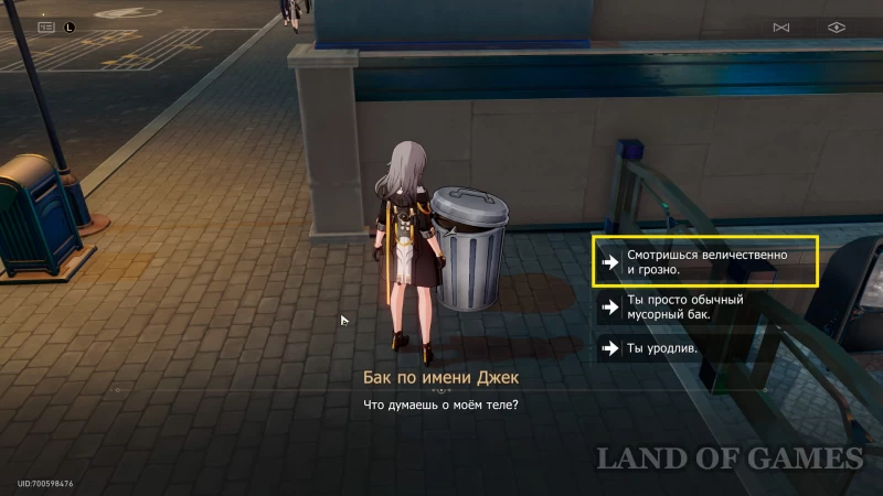 И здесь же, перед подъемом к площадке с 17-м трофеем, стоит неприметная Жадная мусорка. Чтобы получить от нее награду, а не удар с ноги, выбирайте такие ответы: