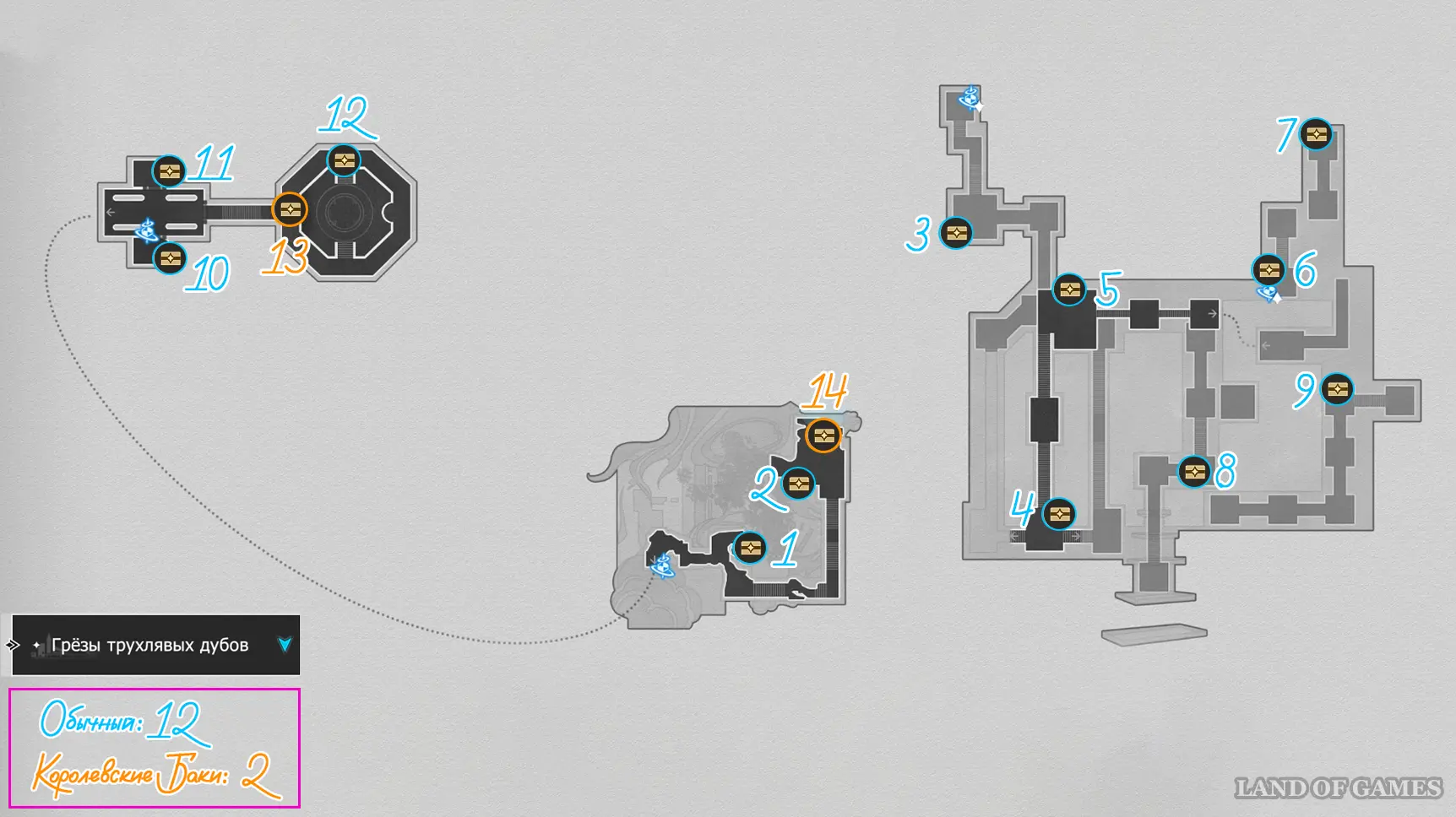 Эта локация состоит из нескольких уровней, в которых можно отыскать 12 обычных сундучков и 2 королевских мусорки. На карте ниже можно будет посмотреть их примерное расположение. Доступ к данной локации у вас откроется в рамках новой квестовой цепочки «Память что увертюра в снах», однако мы советуем вам взяться за ее исследование уже после прохождения всех миссий линейки, чтобы вы смогли посетить все уголки области. В отдельном гайде мы в деталях рассказали, как до них добраться.