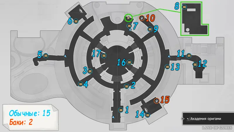 На территории данной локации можно отыскать 16 обычных сундуков и 2 Бака , причем сделать это вам удастся только после начала выполнения сюжетной цепочки под названием «Прощай, Пенакония». Приготовьтесь к сражению с элитными врагами, а также решению загадок. Подробную информацию по поиску ларцов с сокровищами можно найти в нашем отдельном руководстве.