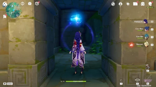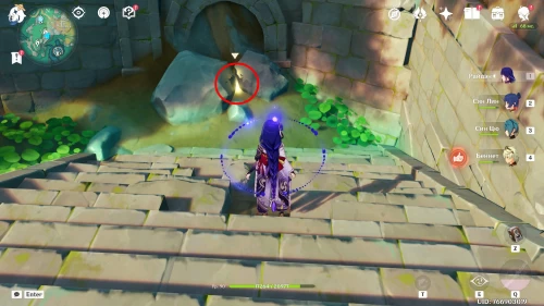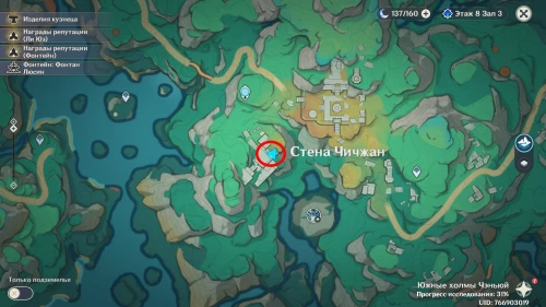 Телепортируйтесь к статуе семи Архонтов на Стене Чичжан, а затем пройдите на юг к развалинам здания. Здесь вы обнаружите ступеньки, ведущие в никуда, а среди булыжников будет светиться белый огонек – взаимодействуйте с ним, чтобы отыскать ржавый ключик.