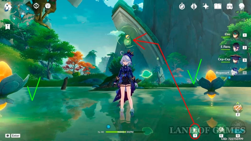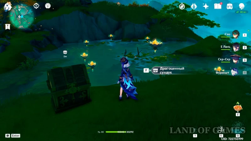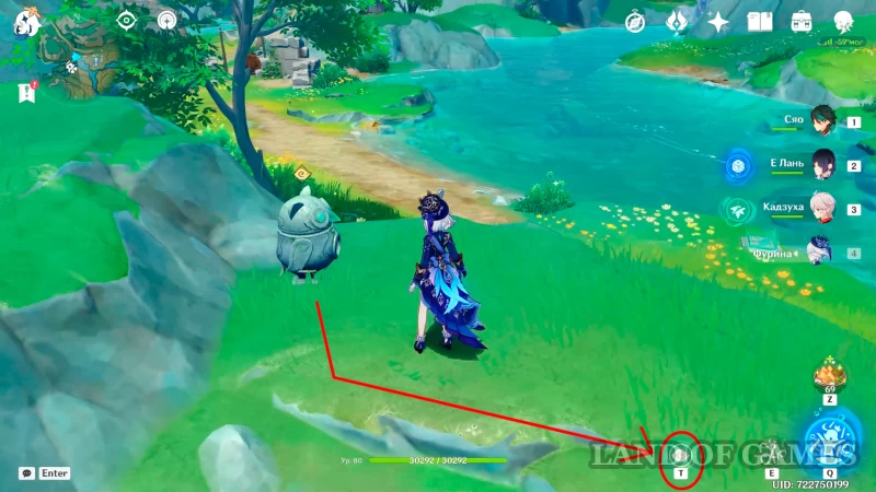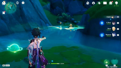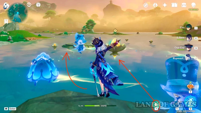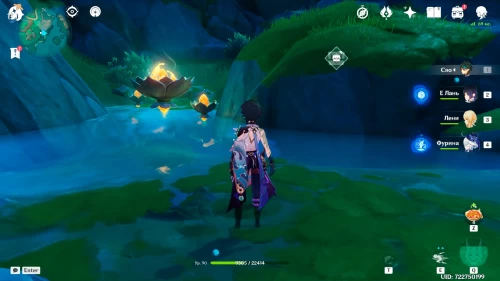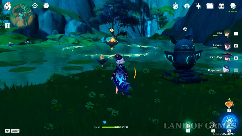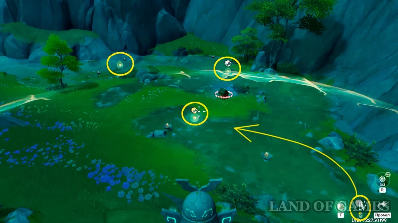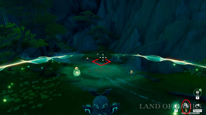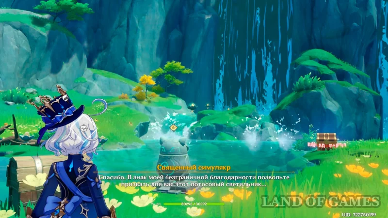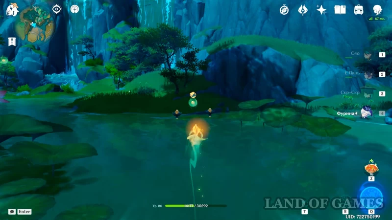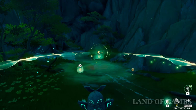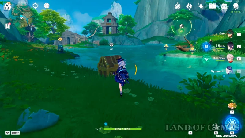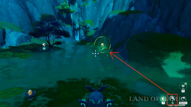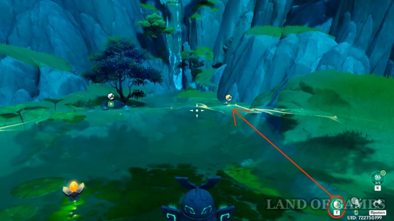 Для начала, разберитесь с кучкой крио слаймов, которые заинтересовались статуэткой совы. После боя, подберите фигурку и поставьте ее на мерцающий изумрудным постамент перед рекой навыком Адепта. Оказавшись на своем месте, сова даст сундучок, а от водопада к нам подплывет кувшинка с полем — ее можно сразу подобрать.
