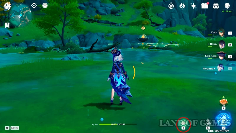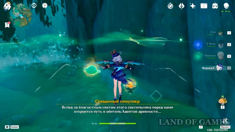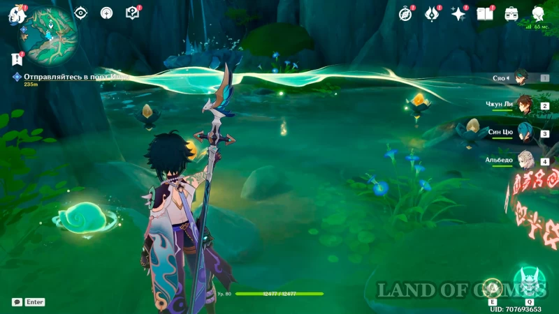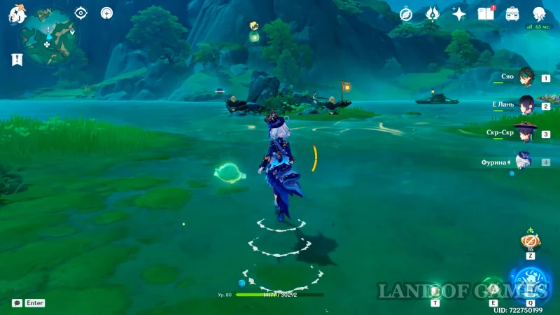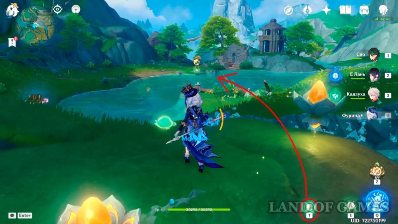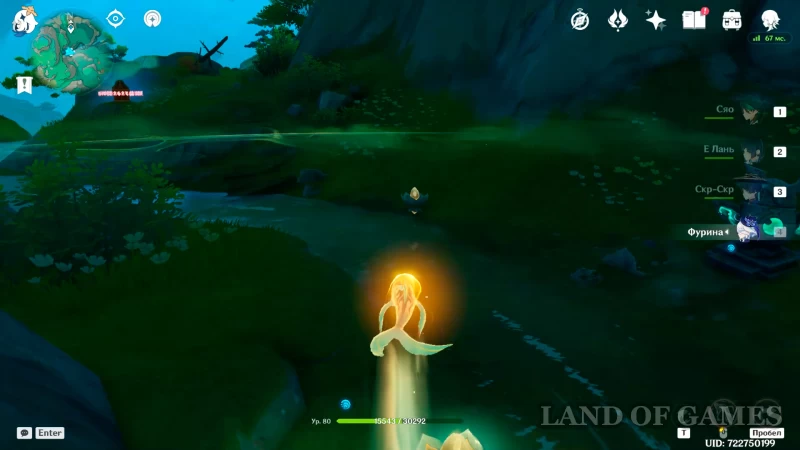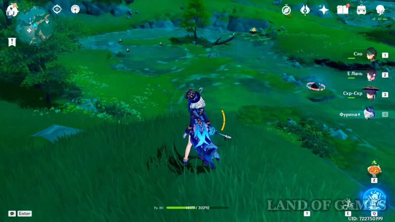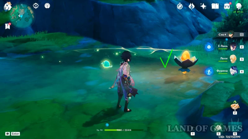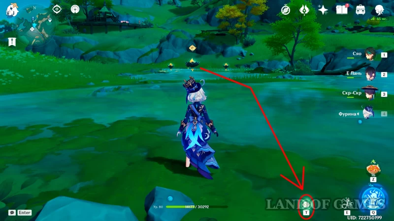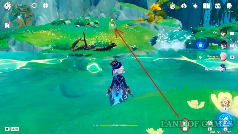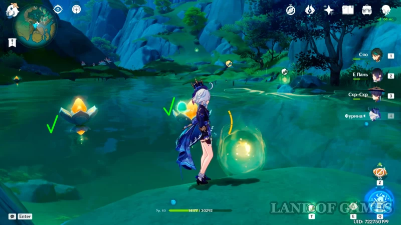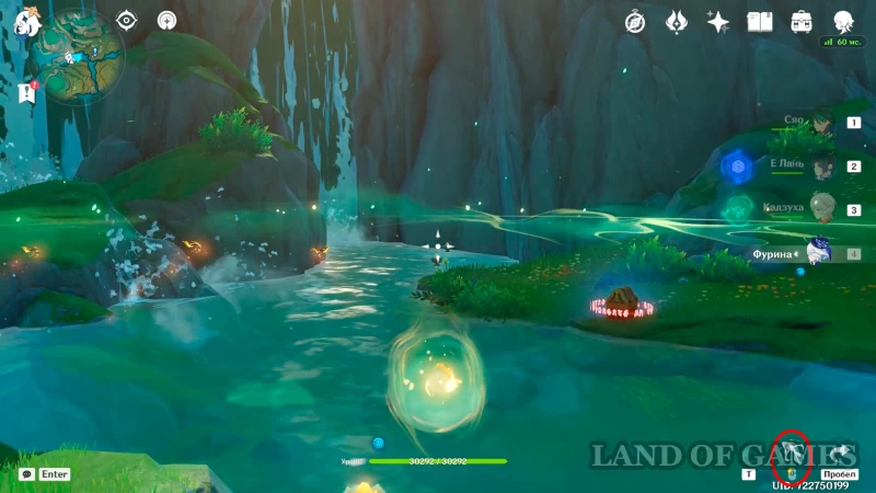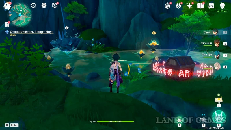 Для начала, разберитесь с кучкой крио слаймов, которые заинтересовались статуэткой совы. После боя, подберите фигурку и поставьте ее на мерцающий изумрудным постамент перед рекой навыком Адепта. Оказавшись на своем месте, сова даст сундучок, а от водопада к нам подплывет кувшинка с полем — ее можно сразу подобрать.