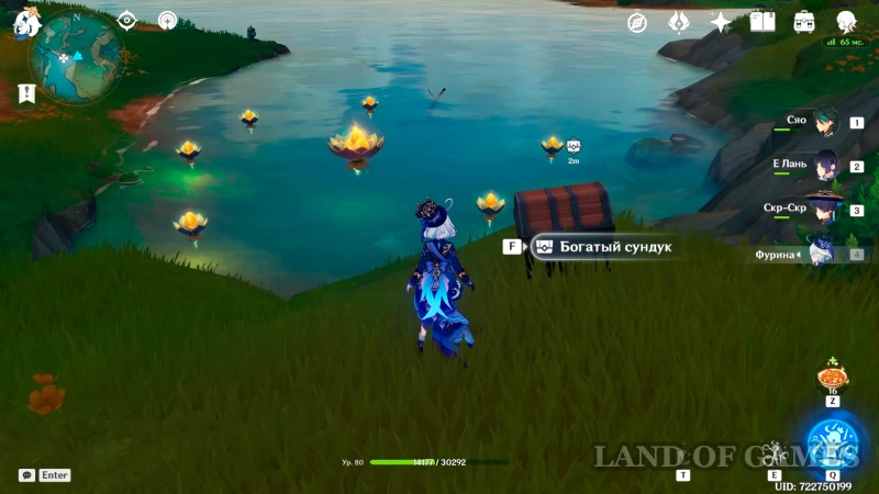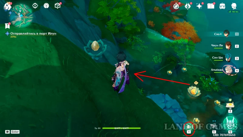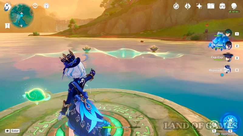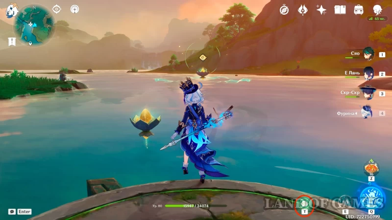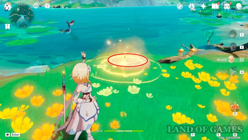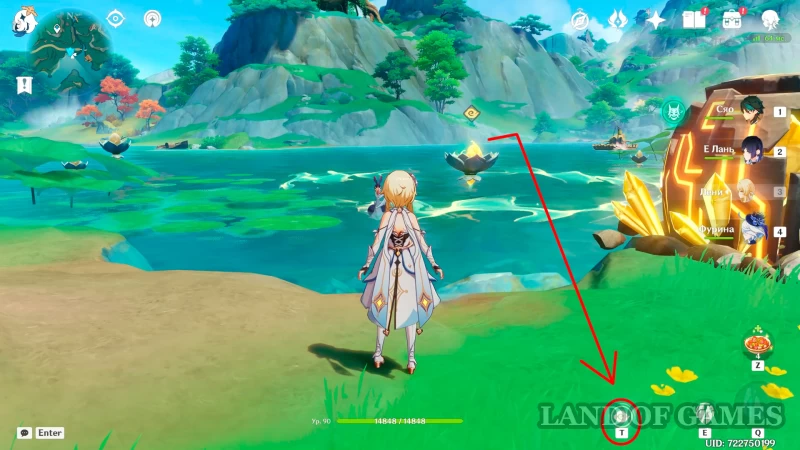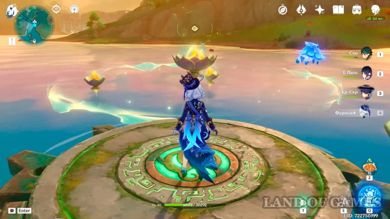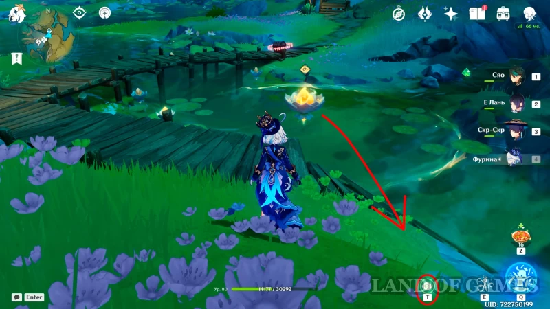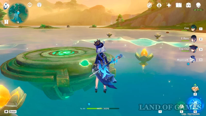 Начнем с юго-западного побережья неподалеку от горы Сюаньлянь. Здесь вы найдете каменную платформу с крупным фонарем, держащуюся на воде. Подберите лотос навыком Адепта и заберитесь на плиту (в ее области зажгутся ближайшие цветки).