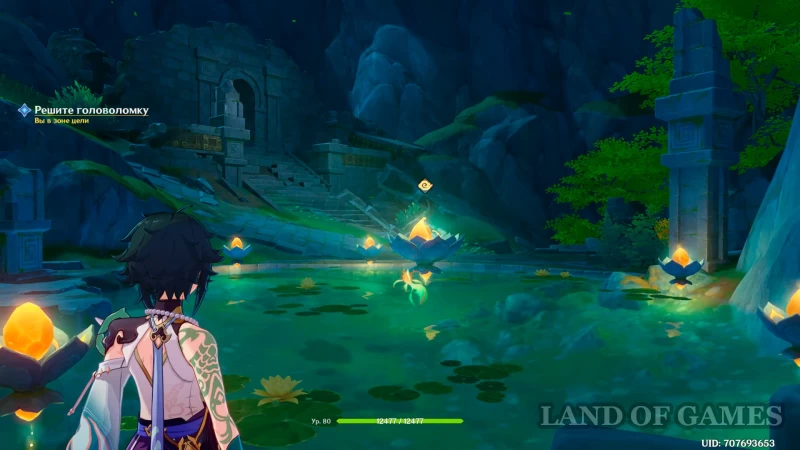 - Установите ее между тремя другими лотосами так, чтобы все они зажглись (указали на скриншоте выше);