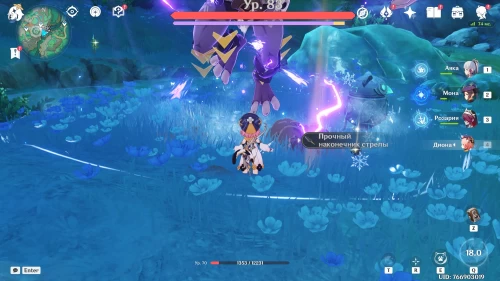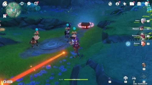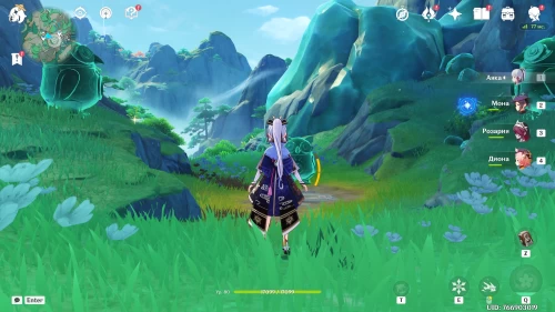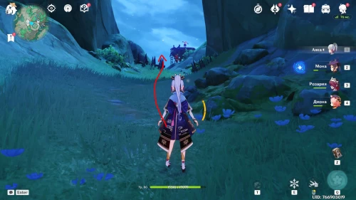 Теперь бегите на восток, спускаясь вниз по тропинке. Вскоре справа посреди воды вы увидите островок со статуей симулякра, вокруг которой собрались хиличурлы – притянитесь к ней с помощью силы Адептов (клавиша «Т»), дабы сразу убить всех врагов.