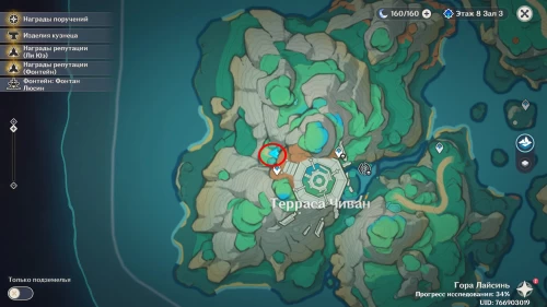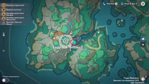 Переместитесь к телепорту на террасе Чиван, а затем подойдите к северному краю каменной площадки и спрыгните вниз. Сразу же развернитесь, и вы увидите на дне ущелья заблокированный сундук и группу хиличурлов – спуститесь туда.