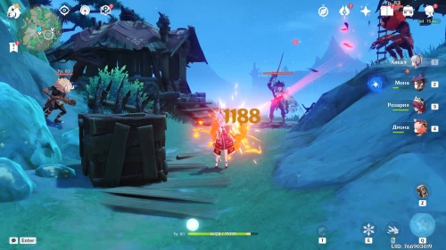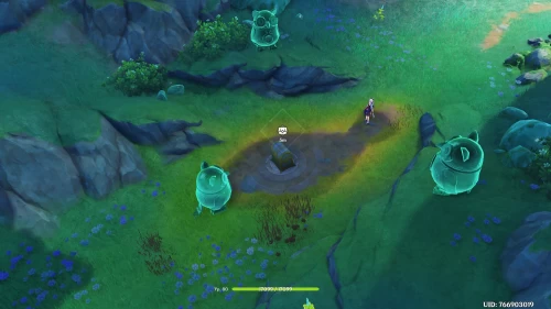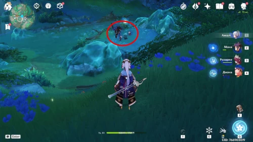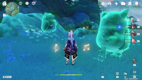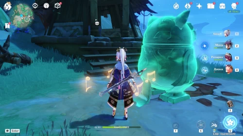 Теперь двигайтесь по тропинке на запад, и вы найдете здесь небольшой лагерь хиличурлов. Разберитесь с Гидро хиличурлом-изгоем и его приспешниками, чтобы появилась вторая призрачная статуя. Не забудьте также открыть сундучок в лачуге.