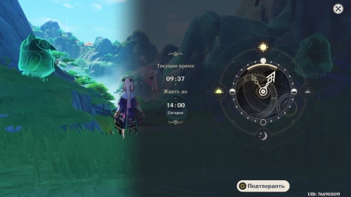 Теперь возвратитесь к самому первому симулякру. Здесь вы обнаружите уже сразу три статуи. Ударьте их, чтобы послушать подсказки. Одна из них укажет на «полдень», поэтому перемотайте время на 14:00 через меню Паймон, а потом просто постойте немного рядом с круглой каменной площадкой на земле.