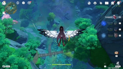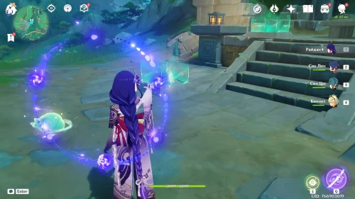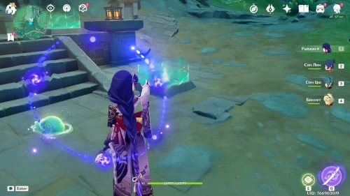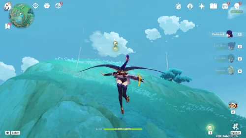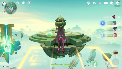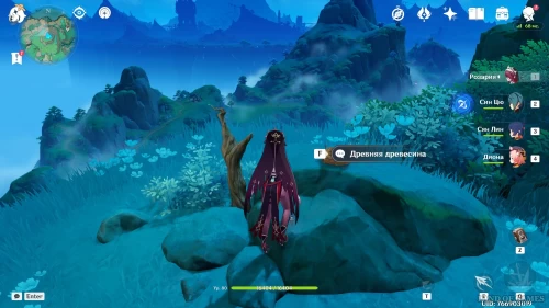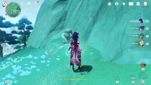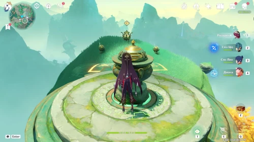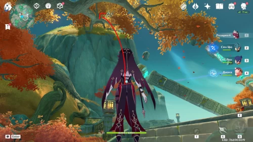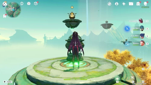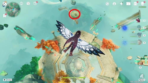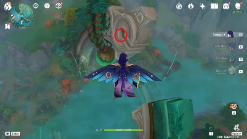 Переместитесь к телепорту в юго-западной части указанной локации, а затем подойдите к летучему симулякру на востоке у подножья скалы и совершите прыжок, чтобы притянуться к водяной жемчужине наверху (клавиша «Т»). Запустите себя еще выше, дабы взобраться на вершину горы.