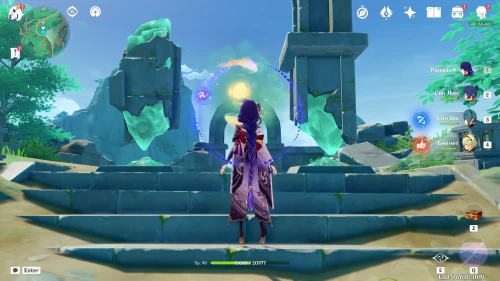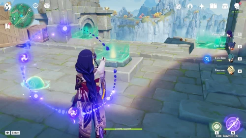 Разберитесь с группой хиличурлов, охраняющихся священный симулякр, а потом заберите статую, поднимитесь на руины и разместите ее на средней квадратной площадке, как показано на картинках ниже.