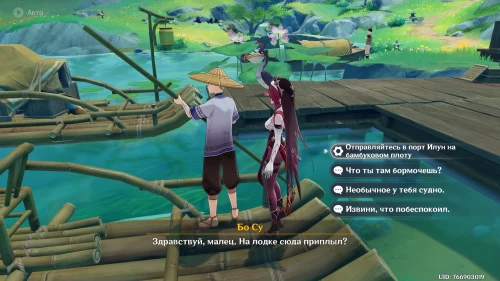 Телепортируйтесь к статуе Гео Архонта в восточной части области, а затем бегите на запад к местным докам. Здесь вы обнаружите мужчину по имени Бо Су, владеющего бамбуковым плотом.