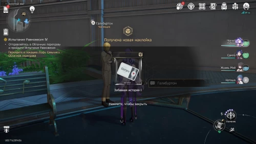 Отправляйтесь к якорю «Вестибюль отеля» в локации Отель «Грезы» (реальность), а затем пройдите немного вперед и рядом со стойкой регистрации отыщите Пенелопу и Уэсли. Послушайте их беседу, чтобы начать скрытый квест. Пройдите его, и вы получите нужную наклейку.