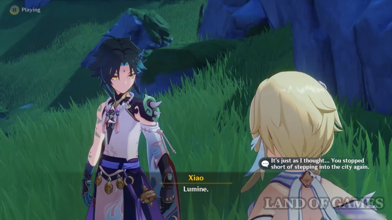 Рядом с храмом Бронзового воробья найдете Сяо. В отличие от других персонажей, вступить с ним в диалог можно будет два раза. В первый раз посмотрите короткую кат-сцену, а во второй – послушаете слова благодарности молодого человека.