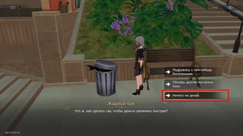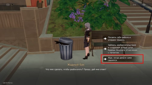 Этот бак стоит рядом со скамейкой в северной части области. Он будет искать быстрый способ разбогатеть. Мы отметили подходящие реплики на картинках далее.