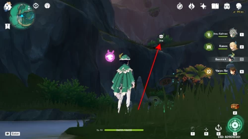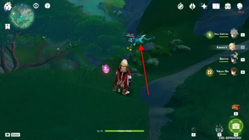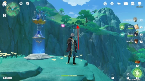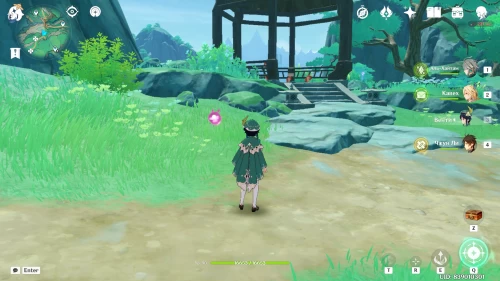 Продолжайте спускаться по тропинке, на которой находились предыдущие два сундука. Оказавшись внизу, зайдите в беседку, где сидят белки. В этот момент мимо вас проплывут три анемо слайма. Лопните их, чтобы появился ларец.