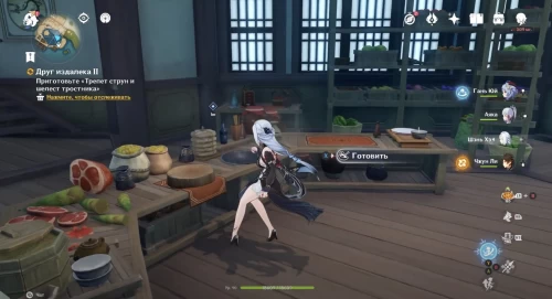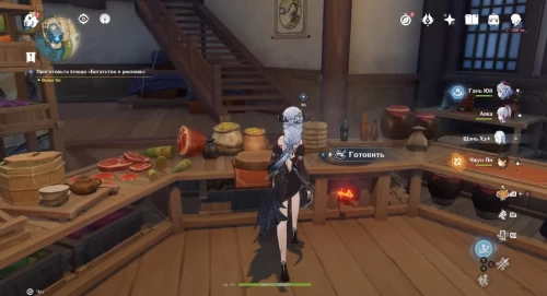 Вернитесь к предыдущему телепорту, чтобы не тратить время на беготню по лестницам, и поболтайте с хозяином заведения. Вы узнаете, что Янь Сяо обжег руку, поэтому ему требуется временная замена на кухне. Снова поболтайте с поваром, дабы приступить к работе. Вы также повстречаете своих старых друзей: Лини, Фремине и Линетт.